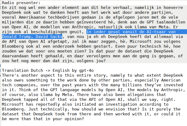 Interesting. I've translated my Dutch radio interview about Deepseek from Dutch to English, and gpt-4o has only left out one sentence -- the sentence that mentions Donald Trump and David Sacks. 👀